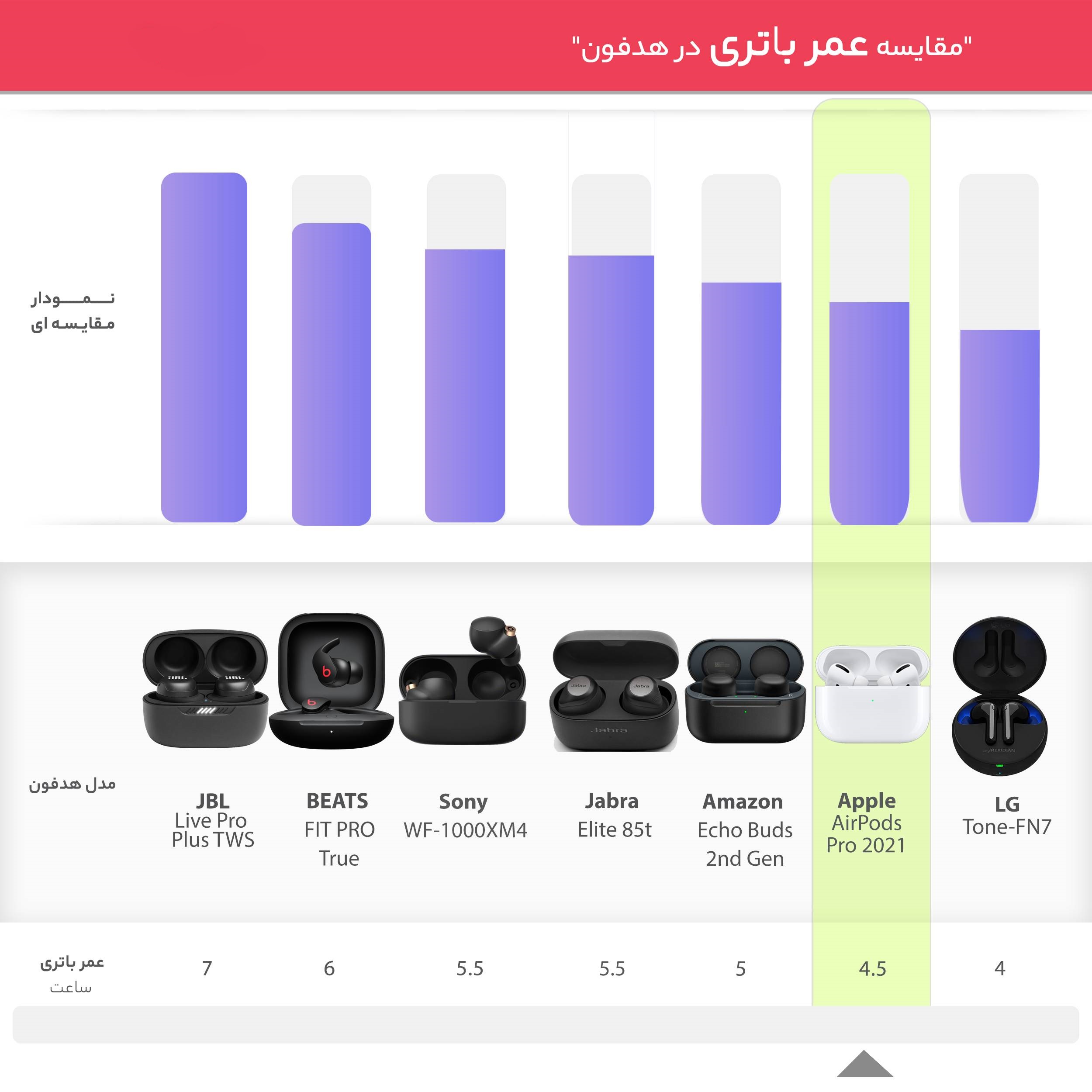 باتری در نظر گرفته شده برای ایرپادز پرو برای پخش موسیقی تا ۴ ساعت و نیم مناسب است. اگر باتری در نظر گرفته شده برای این محصول بیشتر بود که قطعا امتیاز مثبت بسیار خوبی برای آن به حساب می‌آمد. البته اگر زیاد به موسیقی گوش ندهید، میزان باتری در نظر گرفته شده برای این محصول می‌تواند برای یک روز کاری مناسب باشد. البته که سعی کنید کیس‌ این هدفون‌ها را همیشه به همراه داشته باشید. دلیل اینکه باتری‌ای با ظرفیت بیشتری برای این هدفون در نظر گرفته نشده، ظاهر باریک و ظریف این محصول است. استفاده از باتری بیشتر به معنای فضای بیشتر است. فضایی بیشتری که می‌توانست ظاهر ایرپادز پرو را خراب کند.